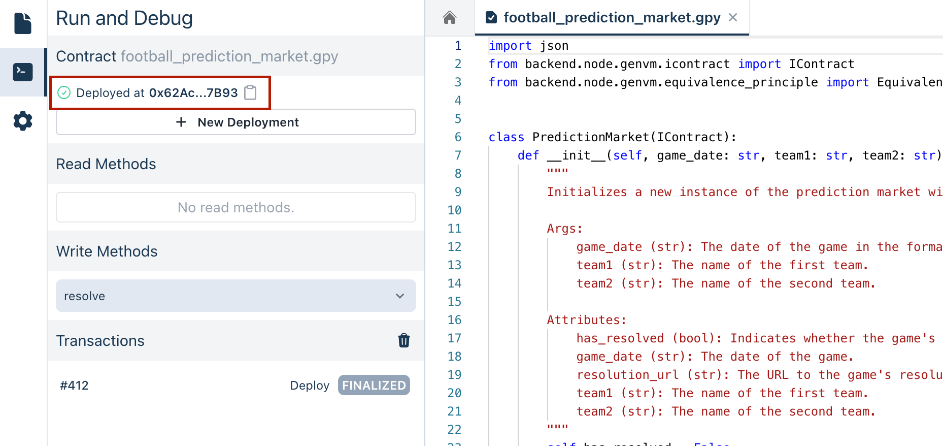 To interact with the deployed contract, go to the Write Methods section. Here, you can call the resolve method to process the game's result. This triggers the contract's logic to retrieve the game's data and determine the outcome based on the Equivalence Principle criteria defined.