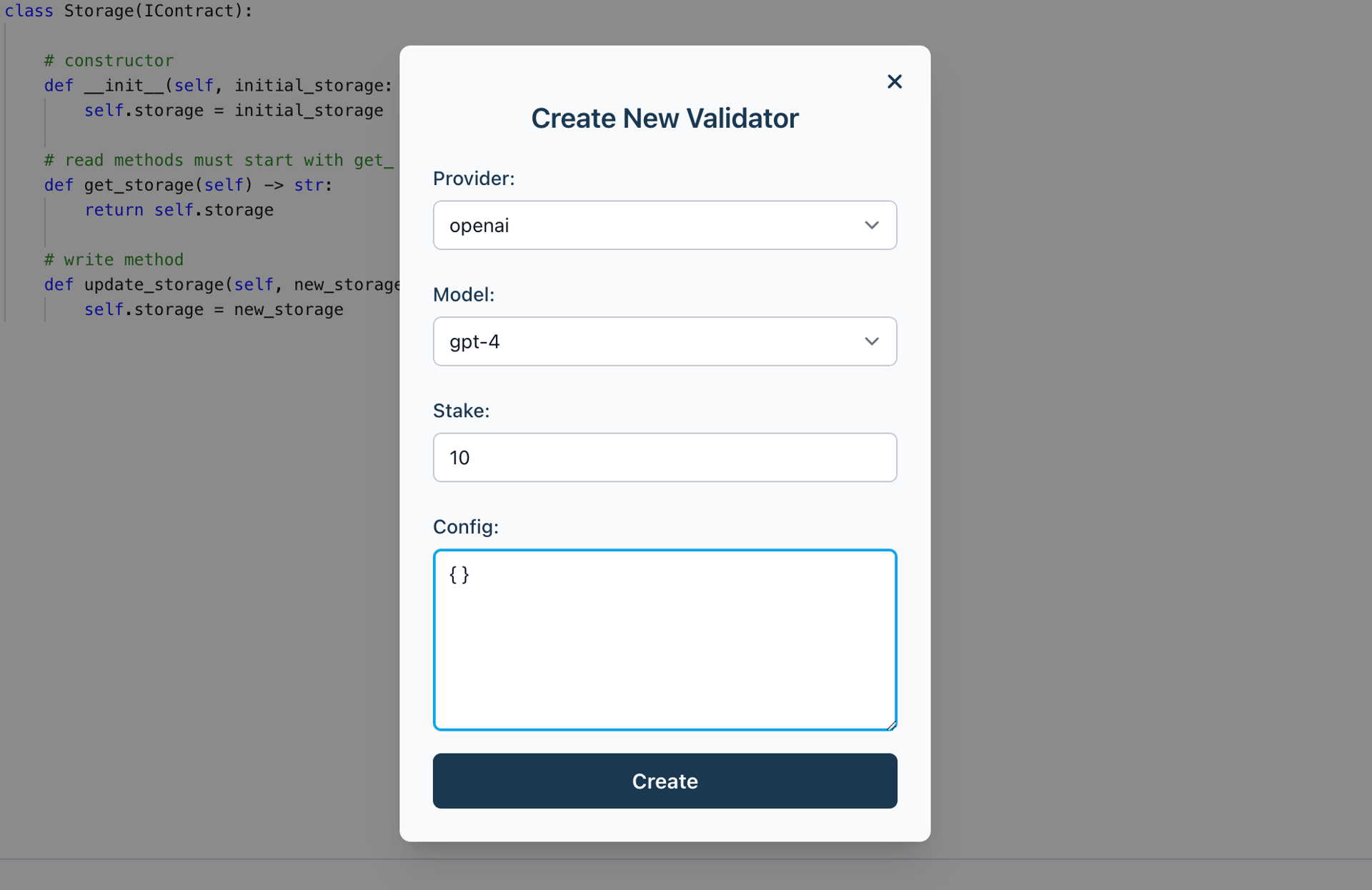 Create New Validator: In the validator creation dialog, fill in the required fields: